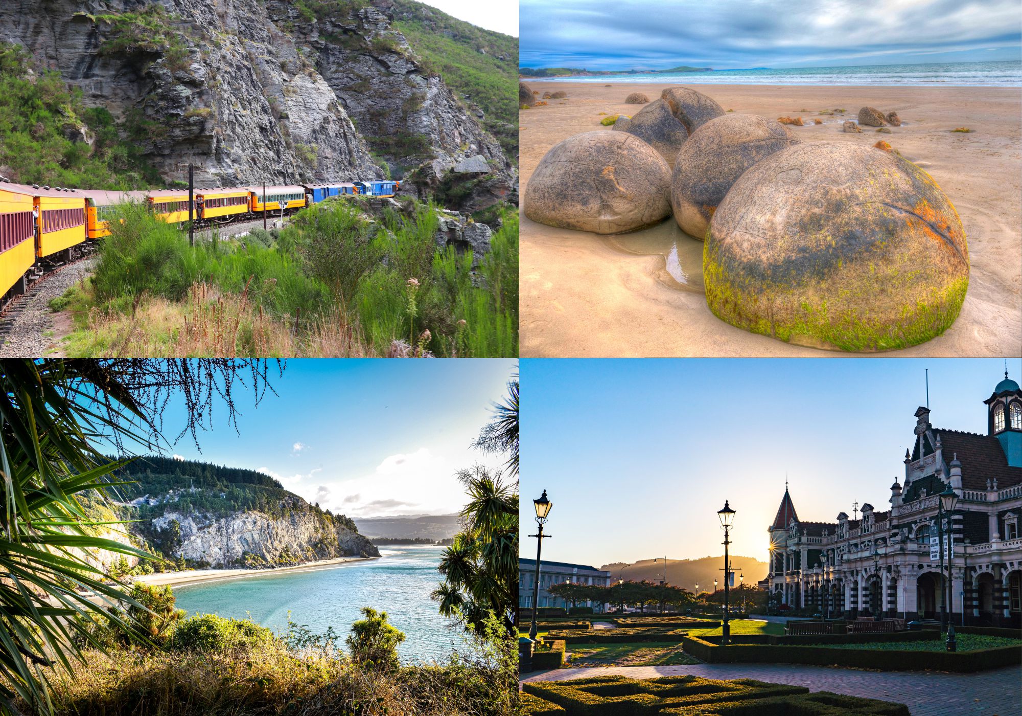 Head inland aboard Taieri Gorge Railway, departing from the charming gingerbread Dunedin Railway Station, for a four-hour excursion past former gold-mining sites.